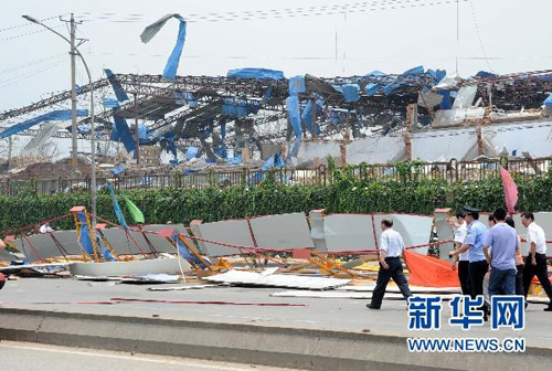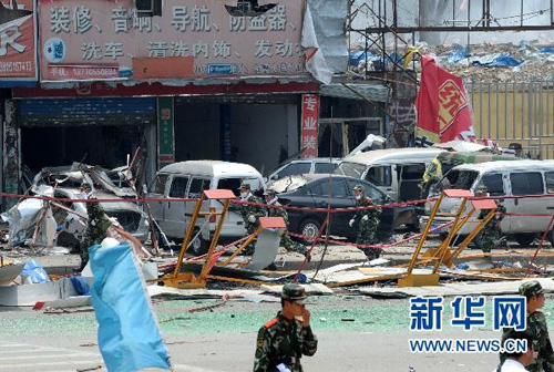 ?7月28日,爆炸現(xiàn)場附近的建筑物及公路施工圍擋被毀壞。新華社記者孫參攝