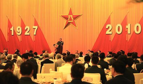 節(jié)日的人民大會(huì)堂燈火輝煌,花團(tuán)錦簇,洋溢著喜慶氣氛。主席臺(tái)帷幕中央懸掛著巨型“八一”軍徽,兩旁是十面鮮艷的紅旗?!?927-2010”幾個(gè)醒目的大字,昭示著中國(guó)人民解放軍走過了83周年的光輝歷程。