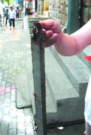 ????“我們懷疑這些支撐門頭的螺絲、角鐵有質(zhì)量問題,很多都已經(jīng)銹斷了,這些門頭一天比一天往下沉,現(xiàn)在比當初已經(jīng)沉降了20多厘米了?!苯壬钢T頭背面告訴記者,他懷疑就是因為這些建材質(zhì)量不過關(guān),導致了旁邊5家店的門頭整體沉降。