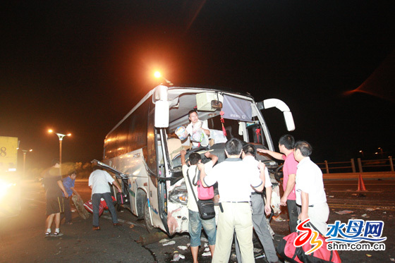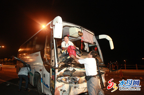 青島旅游大巴車撞翻煙臺拖拉機,18名來自湖北恩施的乘客受傷入院。圖為事發(fā)現(xiàn)場。柴向陽 攝影