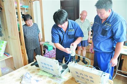 ????昨日下午1時(shí),記者隨四流南路一家環(huán)境檢測(cè)公司來(lái)到市民周先生家,這已經(jīng)是環(huán)境檢測(cè)公司第四次“光臨”周先生位于寧夏路上的新居。按照檢測(cè)公司的要求,周先生已經(jīng)將主臥室關(guān)窗封閉長(zhǎng)達(dá)6小時(shí)以上,當(dāng)記者與工作人員推門(mén)進(jìn)入時(shí),混雜的化學(xué)原料氣味兒迎面撲來(lái),在悶濕的空氣中格外刺鼻。進(jìn)入房間,記者看到里面擺放著松木質(zhì)地的大衣櫥、床、床頭柜和一個(gè)寫(xiě)字臺(tái)。“這是我第三次來(lái),沒(méi)想到氣味還是這么沖?!睓z測(cè)公司的李師傅麻利地打開(kāi)兩個(gè)工具箱,將檢測(cè)空氣中甲醛含量的儀器一一擺好,然后退出臥室。