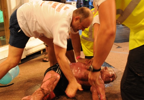 俄羅斯選手拉迪任斯基休克后被抬出桑拿房進行搶救。 新華社記者趙長春攝