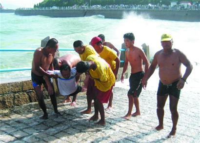 ![]() ????早報(bào)訊 昨日,一名醉酒市民在棧橋浴場西端礁石區(qū)下海,被大浪困在海中20多分鐘無法上岸,危急時(shí)刻,先后有2名市民跳入海中施救,但都未能成功。最后在棧橋浴場6名救護(hù)隊(duì)員的援救下,落水者和兩名救人市民均被拉上岸來。 ????“浪窩子”里困住3人 ????“那個(gè)地方是個(gè)浪窩子,平時(shí)也無風(fēng)三尺浪?!睏蛟鰣鲩L韓培金告訴記者,下午3時(shí)30分,一名50多歲的男子從棧橋浴場東側(cè)礁石區(qū)的大壩沿樓梯走到海邊。此時(shí)正是高潮時(shí)間,大浪不間斷地拍擊礁石。這名男子突然跳進(jìn)大海,在浪涌中游了五六分鐘,轉(zhuǎn)身要游回岸邊。但浪涌拍到岸邊立刻形成5米多高的回涌浪,將這名男子推回深水。眼見這名男子無法靠岸,在附近游泳的一名男青年跳進(jìn)海中,試圖將其拉到岸邊,但兩人均被大浪困在海中。經(jīng)過10多分鐘的努力,兩人往東游了30多米,靠近一處斜坡。此時(shí),一名正在附近工作的環(huán)衛(wèi)工人見狀也跳進(jìn)海中救人。 ????6人搭人梯救起3人 ????正在斜坡東側(cè)清理滸苔的浴場救護(hù)隊(duì)員見此立刻沖了過去。救護(hù)隊(duì)員將兩個(gè)救生圈拋入海中,但由于海浪太大,三人即使抱著救生圈也無法上岸?!皝恚钊颂菥热恕!?名救護(hù)隊(duì)員根據(jù)地形,即刻商量出救人方案。2人跳入海中協(xié)助托人,2人一手抱著斜坡的護(hù)欄往上拉,剩余2人在岸上往上拖。最先被拖上岸的是體能保存較好的環(huán)衛(wèi)工人,隨后救人男青年也被拉上來。由于落水的中年男子體力不支,下水的救護(hù)隊(duì)員好容易才將其拖近斜坡。此時(shí),落水者已經(jīng)腿腳發(fā)軟,另外2名救護(hù)隊(duì)員又跳進(jìn)海里,4人共同用力,才將其托到岸上。 ????借酒勁下?!熬饶浮?/strong> ????120急救車將3人送到市立醫(yī)院救治。兩名救人者抹了點(diǎn)藥離開。據(jù)落水市民講,他姓王,下午他在岸邊喝了半瓶白酒后上了酒勁,突然看到海中漂著一塊泡沫 “很像前些天落水的母親”,就跳入海中。(趙健鵬) |