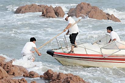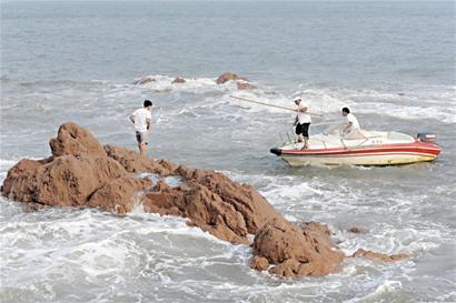 ????記者趕到魯迅公園時(shí),只見距離海邊50米遠(yuǎn)處的礁石上,一名男子蜷縮著蹲在礁石的最高點(diǎn)上,浪花不斷拍打著礁石,浪花飛濺在男子身上?,F(xiàn)場(chǎng)的110民警聯(lián)系八大峽邊防派出所,準(zhǔn)備出動(dòng)快艇營(yíng)救。下午4時(shí)36分,一艘快艇出現(xiàn)在遠(yuǎn)方,快速向被困男子靠近,可是由于海邊暗礁太多,此時(shí)水位不高,快艇試探多次仍無法靠近。4時(shí)41分,一個(gè)大浪過來,快艇借勢(shì)快速跳過暗礁,終于靠近了礁石,將男子一把拉到了快艇上,隨即送到了岸邊。 吳帥 于滈 徐棟