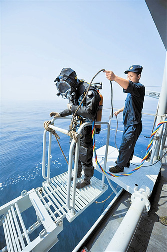 ????失事潛艇在東救332船的援助下,成功解決了機械故障。13時許,潛艇從海底重新上浮到海面,援潛救生演練宣告成功。海軍某防救大隊大隊長馮永勇告訴記者,首次用新型潛水裝具進行水下80米氦氧潛水,填補了海軍援潛救生歷史的空白,標(biāo)志著海軍援潛救生能力實現(xiàn)了突破。