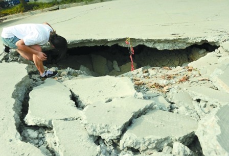 ????他聽鄒師傅說,大前天晚上六七點的時候,突然聽到“轟”的一聲。出來一看,企業(yè)門口不遠處的公路塌方了,出現(xiàn)了一個“能把人埋進去”的口子。