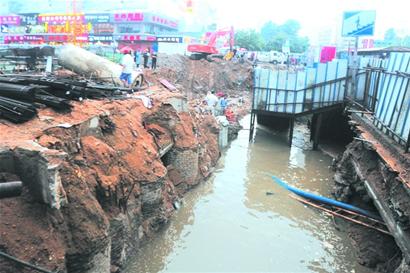 ????記者在地下通道北側(cè)入口看到,入口旁邊已被施工人員挖出一個大坑,坑內(nèi)滿是污水,大坑與地下通道北側(cè)入口間只有一些捆扎起來的鐵板圍擋,大水從圍擋縫隙向地下通道內(nèi)涌入。大坑一側(cè)停著一輛挖掘機(jī),旁邊還有一根斷裂的管道。商鋪老板們告訴記者,這段管道好像7月份就挖壞了,一直沒有修理,這次發(fā)大水可能與被挖壞的管道有關(guān)。