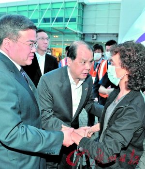 26日,香港特區(qū)政府勞工及福利局局長張建宗(中)慰問梁頌學(xué)的母親。