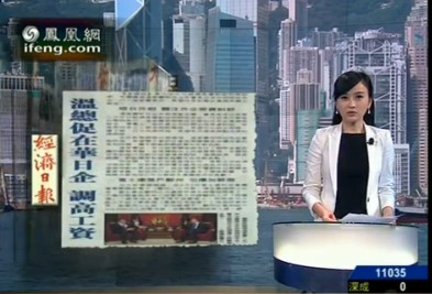 ????鳳凰衛(wèi)視8月30日《鳳凰早班車》節(jié)目播出“溫家寶會(huì)見岡田克也促在華日企調(diào)高工資”,以下為文字實(shí)錄:
