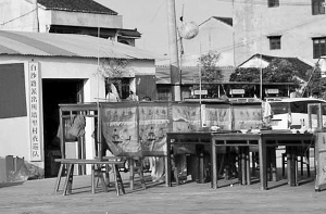 ????這個題為《荒唐!派出所請來道士祈福消災(組圖)》的帖子提供了當事現場的三張照片,照片內容清楚地顯示了當時的場景,舉辦人在一間掛有“白沙路派出所墻里村夜巡隊”牌子的棚屋門口前支起了一個由十來張桌子組合成的道場,幾十米外的電線桿上掛上了名為“眾人祈福國泰民安世界和平消災焰口法會”的宣傳橫幅,道場至橫幅中間有一隊從事法事活動的人正魚貫而出。