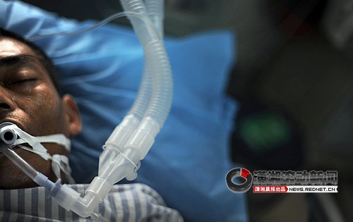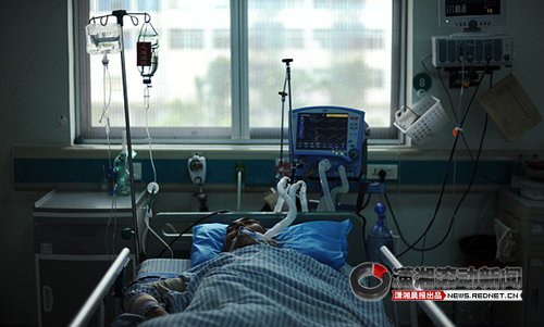 周道明正躺在湘潭市中心醫(yī)院的重癥監(jiān)護室,靠呼吸機和點滴維持生命。 圖/瀟湘晨報滾動新聞記者 楊抒懷