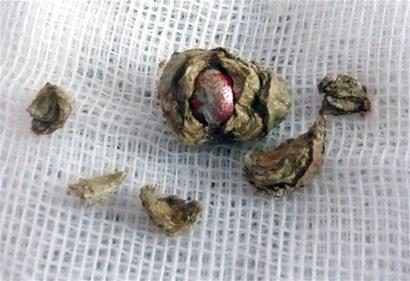 ????石頭取出來后,李明華用血管鉗敲了敲,外邊竟然掉下了一層,隨后他使勁一敲,外邊的殼全掉了下來,里邊還包著一個褐色的東西。“里邊這個東西是個珠子。”李明華推測說,可能當(dāng)年,劉青把這顆珠子塞進(jìn)了鼻孔,當(dāng)時沒有取出來,時間長了在里邊形成了結(jié)石。 (記者 陳珂 攝影報道)