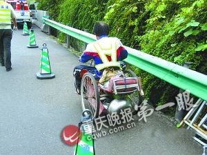 李遠倫搖著三輪自行車在高速上行駛 記者 楊帆 攝