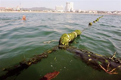 ????“這段防鯊網(wǎng)很明顯是人為破壞的,之前別管海上風(fēng)浪有多大,海里的防鯊網(wǎng)固定錨只可能被浪推離原位,根本不可能從中間撕破?!庇浾呗?dòng)嵹s到第一海水浴場(chǎng),救護(hù)隊(duì)隊(duì)長(zhǎng)宗志忠告訴記者,9月6日清晨6點(diǎn)左右,浴場(chǎng)救生員劃救生船出海時(shí)發(fā)現(xiàn),原本在距離海岸350米位置的防鯊網(wǎng)竟然斷了,兩端掛著浮漂的防鯊網(wǎng)被海浪推到游泳區(qū)域內(nèi),幸好當(dāng)時(shí)在海上游泳的市民不多,他們及時(shí)將斷裂的近百米防鯊網(wǎng)清理到岸邊,否則萬(wàn)一有游泳者被斷裂的防鯊網(wǎng)纏住,后果不堪設(shè)想。