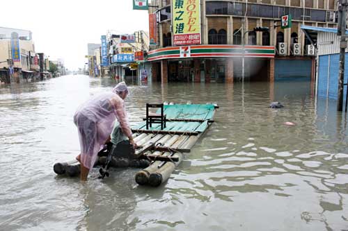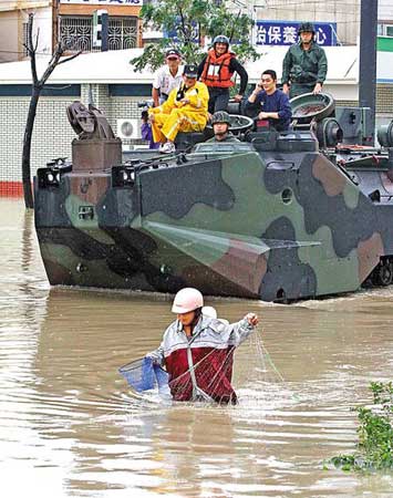 ????在隘寮溪沿岸的萬丹鄉(xiāng),也因溪水溢流成了澤國,“去年"莫拉克"淹水也沒這次大!”鄉(xiāng)長郭寶聯(lián)說,這次興化部落全村水深高過一層樓,以往從來沒有過。甘棠村從未淹水,這次也躲不過,警方救出上百名受困民眾。