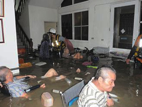“凡亞比”臺風(fēng)帶來驚人豪雨,高雄縣岡山鎮(zhèn)的晉德安養(yǎng)院前晚淹水,院內(nèi)坐輪椅的老人一度受困漂浮水中,經(jīng)紅十字會派人救援才脫困。圖片來源:臺灣《聯(lián)合報》