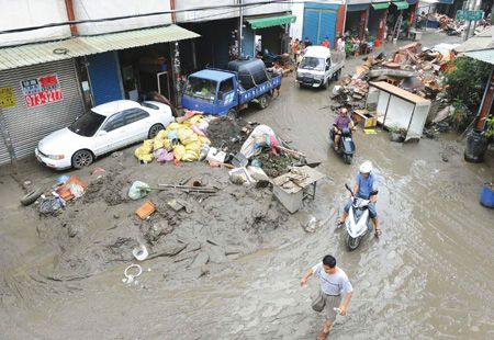 居民忙著清洗房子,街道上堆滿爛泥、垃圾。來源:臺灣《中國時報》