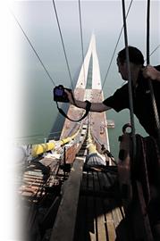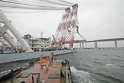 ????昨日下午,在海灣大橋滄口航道橋東側(cè)一段,2600噸起重船 “四航奮進(jìn)號(hào)”將海灣大橋最后一片60米預(yù)制箱梁吊裝到位。據(jù)介紹,60米整孔預(yù)制箱梁,頂板寬17米,底板寬6.6米,高3.5米,重量約2050噸,在中國(guó)同類(lèi)結(jié)構(gòu)橋梁中排在前列,為長(zhǎng)江以北最大的整孔預(yù)制箱梁,預(yù)制和架設(shè)過(guò)程技術(shù)要求高,施工難度大。其吊裝高度超過(guò)杭州灣大橋,為目前國(guó)內(nèi)特大預(yù)制安裝箱梁的最大高度。