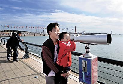 昨日,一位父親帶著孩子在青島奧帆中心內(nèi)遠眺