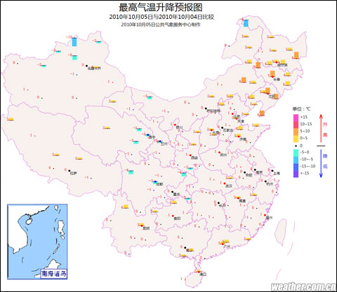 10月5日全國最高氣溫升降預報圖。(圖片來源:中國天氣網(wǎng))