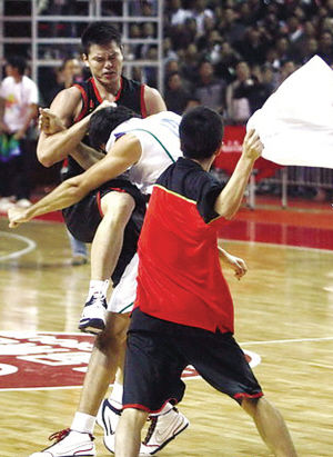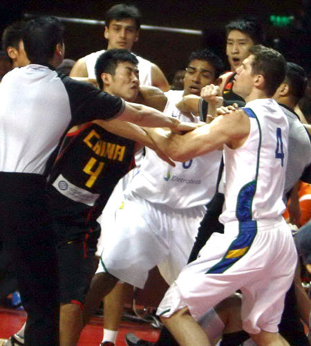????但此事件卻同時(shí)點(diǎn)燃了雙方的火氣,在隨后的一次防守中,丁錦輝與郭艾倫連續(xù)犯規(guī),而且動作都比較大。巴西隊(duì)則以牙還牙,在中國隊(duì)進(jìn)攻時(shí)的籃下?lián)屛恢校?號球員與朱芳雨糾纏到了一塊兒,盡管裁判判罰對方9號犯規(guī),但“朱8”此時(shí)已經(jīng)于對方開始互相推搡,在場球員也紛紛圍攏過來,大規(guī)模沖突正式開始。