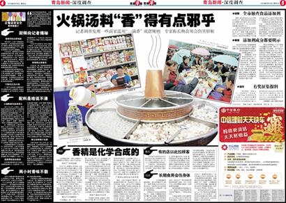 ????9月19日,早報(bào)4—5版以《火鍋湯料“香”得有點(diǎn)邪乎》為題,報(bào)道了一些餐飲單位,在利益的驅(qū)使下濫用添加劑的情況(圖)。記者在調(diào)查中發(fā)現(xiàn),商家使用“一滴香”幾乎成了吸引顧客的潛規(guī)則,一家生產(chǎn)“一滴香”的企業(yè)銷(xiāo)售人員更是向記者表示,他們的產(chǎn)品供不應(yīng)求。報(bào)道見(jiàn)報(bào)后迅速引起了各方關(guān)注。