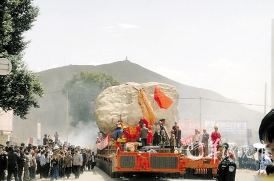 ????網(wǎng)帖說,有人在甘州石前面高擎紅旗,甘州石四面掛上標語。一路上,由警車鳴笛開道,浩浩蕩蕩向古浪縣城蠕動,縣城里人山人海,不少人放鞭炮、燒紙錢迎接。4個小時后,碩大的甘州石被安放在了古浪縣城北一個叫金三角的廣場,美其名曰“城標”。