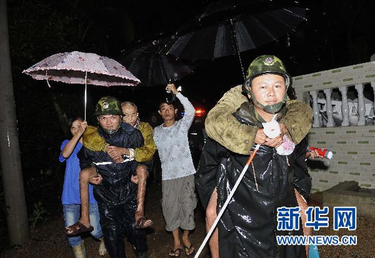 10月16日,海南省萬(wàn)寧市萬(wàn)城鎮(zhèn)民兵預(yù)備役官兵正在轉(zhuǎn)移萬(wàn)城鎮(zhèn)仁里村村民。 15日以來(lái),海南又迎來(lái)新一輪強(qiáng)降雨,多個(gè)市縣再次出現(xiàn)城市內(nèi)澇、村莊群眾被困等災(zāi)情。海南省萬(wàn)寧市政府所在地萬(wàn)城鎮(zhèn)約有1.57萬(wàn)名群眾受困,目前已緊急轉(zhuǎn)移2600余人。新華社記者 郭程 攝