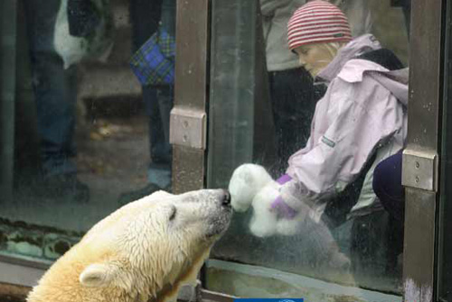??? 據(jù)法新社和《每日電訊報》報道,德國柏林一家動物園的北極熊“納特”不幸被園中同伴排擠欺負,卻在一個小女孩手中的玩具小熊身上找到同胞愛。