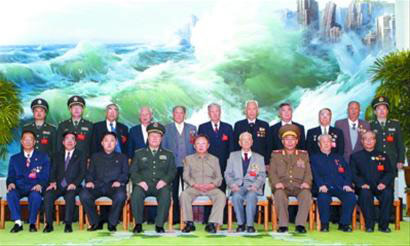 ????金正日(左五)、金正恩(左三)、中共中央軍委副主席郭伯雄(左四)與中國(guó)志愿軍老戰(zhàn)士代表團(tuán)成員合影。