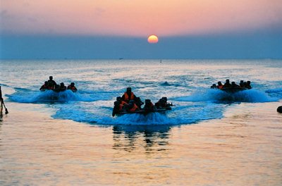 資料圖:解放軍蛟龍-2004海軍陸戰(zhàn)旅兩棲登陸作戰(zhàn)演習(xí),圖為沖鋒舟群向灘頭沖鋒。