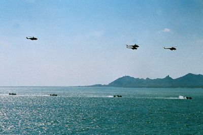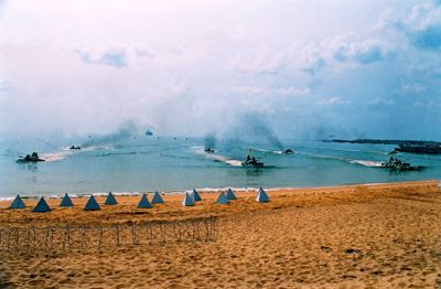 資料圖:解放軍蛟龍-2004海軍陸戰(zhàn)旅兩棲登陸作戰(zhàn)演習(xí),圖為在武裝直升機(jī)的掩護(hù)下氣墊船向岸灘沖擊