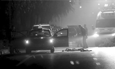 ????涉案的“比亞迪”出租車左前門和右側(cè)前后門均打開,車窗玻璃左側(cè)呈網(wǎng)狀破裂成洞,前燈都亮著。左前車門處的地面上有大量血跡和沾滿血跡的衛(wèi)生紙及幾件衣服,衣服周圍散落著玻璃碎片。車身左側(cè)從前門至車尾部有一條血痕。數(shù)十名警察對周邊進行了戒嚴(yán)。據(jù)相關(guān)技術(shù)人員分析,這條血痕有可能是傷者事發(fā)后,試圖追趕兇手時留下的,說明傷者當(dāng)時的意識比較清楚。經(jīng)現(xiàn)場勘查鑒定,該車車窗玻璃上的破洞是子彈穿透人體后所致。2時30分左右,警方將這輛出租車拖離現(xiàn)場。