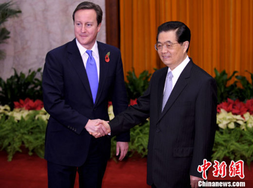 11月10日,中國國家主席胡錦濤在北京人民大會堂會見了英國首相卡梅倫。中新社記者 廖攀 攝
