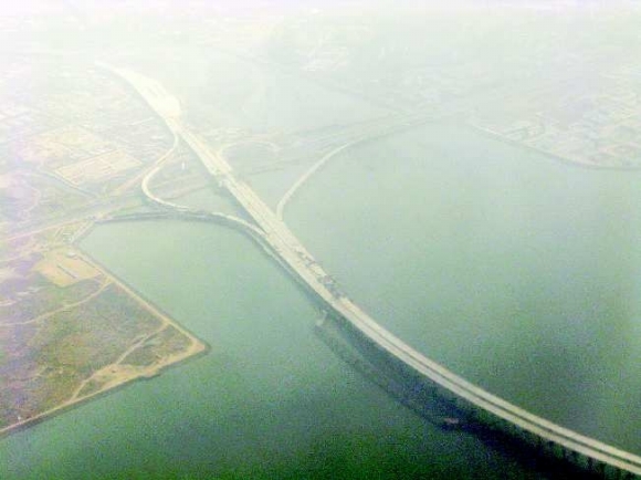 ????12日,記者乘坐飛機(jī)途經(jīng)李村河口附近,正在建設(shè)中的海灣大橋猶如一條巨龍橫臥在膠州灣。據(jù)介紹,海灣大橋?qū)⒂诮衲甑兹€貫通,明年上半年正式通車。建設(shè)中的海灣大橋全長41.48公里,是目前世界上最長的跨海大橋,建成后將青島到黃島的時(shí)間縮短為30分鐘。(記者 楊寧 攝影報(bào)道)