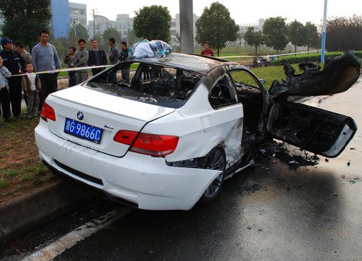 ????保時捷輪子撞飛,寶馬燒得只剩車架