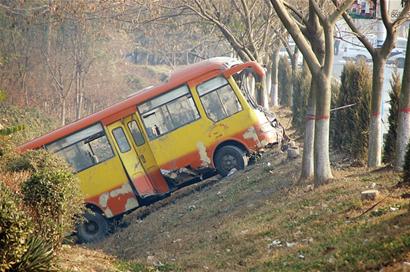 ????昨天上午,記者聞?dòng)嵹s到車禍現(xiàn)場看到,一輛中巴客車頭朝上橫在路溝里,車頭已經(jīng)完全變形,車身經(jīng)過猛烈撞擊也多處受損。而與客車相撞的那輛大貨車則停在離現(xiàn)場50多米的路段,馬路上撒滿了水泥,為了勘查現(xiàn)場,幾名民警正將撒落在路面上的水泥清理干凈。