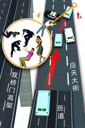 ????晚10點(diǎn)45分,記者趕到事發(fā)現(xiàn)場,這里離雙橋門高架橋大明路下橋口約100多米。此時(shí),現(xiàn)場警燈閃爍,交警在勘察現(xiàn)場。附近居民王師傅告訴記者,被撞飛的分別是一對正在吵架的中年夫妻和三名接到報(bào)警趕到這里來調(diào)解的民警,三名民警中還有一名是女警,其中一名頭部傷得很重的民警是被面包車撞飛好幾米遠(yuǎn),砸中慢車道上一名圍觀的修理工。