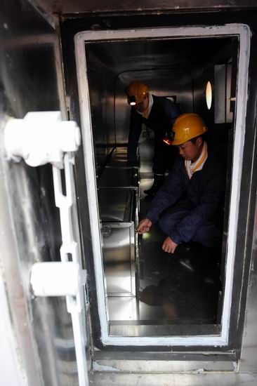 11月18日,兩位礦工在體驗(yàn)救生艙(新華社記者 朱祥 攝)