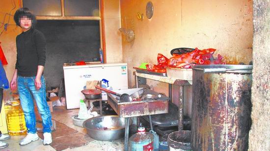 ![]() 孫某的加工點里一片狼藉,加工豬下貨的工具骯臟不堪