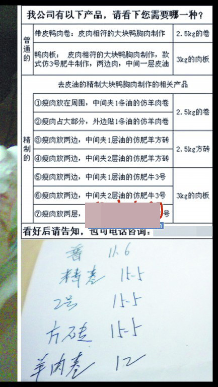 ????在價格列表上,羊肉卷和精制鴨肉卷的價格為13元/kg,肥牛磚和鴨磚的價格為14元/kg,帶皮鴨肉卷的價格則是9元/kg。記者撥通該企業(yè)留下的電話,工作人員表示,“現(xiàn)在羊肉卷和牛肉卷沒有貨,只有鴨肉卷。”