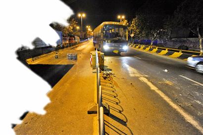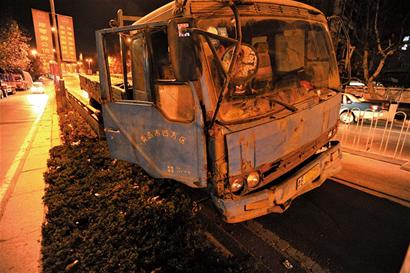 ????22時50分,記者在雁山立交橋南下橋口見到了事故車輛。這輛裝滿方磚的藍(lán)色卡車向右倚在立交橋護(hù)欄上,右前輪爆了胎,卡車占據(jù)了下橋口的整個車道,卡車邊上立起一塊石質(zhì)雨箅子作為警示,但在夜色下這塊 “警示牌”形同虛設(shè),許多車輛都是駛近后才發(fā)現(xiàn)路邊的卡車已經(jīng)爆胎。讓記者驚訝的是卡車后面約20米的排水溝全被軋壞,雨箅子有的被整個掀開,有的被軋得粉碎,橋護(hù)欄有明顯的摩擦過的痕跡。