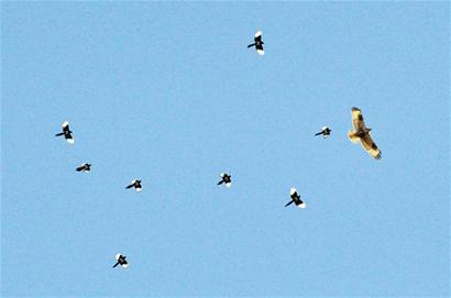 ????早報訊 一只老鷹私闖到喜鵲的領(lǐng)地,遭到了9只喜鵲的群毆,喜鵲們用嘴猛啄老鷹的身體,老鷹勢單力孤節(jié)節(jié)敗退,喜鵲們在后面緊緊追趕,不時將老鷹圍在中間發(fā)動攻擊,最后老鷹改變策略飛到高空中才算徹底掙脫了喜鵲們的包圍圈。這是昨天中午,記者采訪途經(jīng)風(fēng)河下游時看到的有趣一幕。