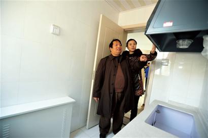 ????47歲的項(xiàng)本勝和妻子走進(jìn)9號樓一套三居室戶型,近50平方米的房間已經(jīng)完成精裝修,廚房、衛(wèi)生間地面和墻上都鋪好了瓷磚,客廳臥室地面鋪有復(fù)合地板?!斑@些灶具別的房子都有吧?!笨吹綇N房中的一體櫥柜、打火灶、吸排油煙機(jī),項(xiàng)本勝有點(diǎn)不相信廉租房會有這么齊全的設(shè)施,在得到工作人員的肯定回答后,兩口子樂得合不攏嘴。