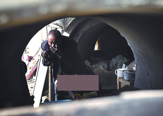 他的家由兩節(jié)水泥管組成,一節(jié)睡覺,一節(jié)放雜物。