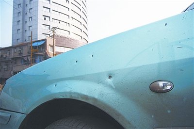 ????昨日上午,記者現(xiàn)場看到,警方在事發(fā)路段拉起警戒線,展開現(xiàn)場勘查。馬路中間雙黃線附近路面有一處約1平方米呈現(xiàn)放射狀的深色痕跡,路邊一輛608公汽車身左側(cè)中部的兩塊擋風(fēng)玻璃粉碎,車廂內(nèi)撒滿玻璃碎片。一輛車牌號為鄂AXE363的出租車駕駛座位旁的車窗玻璃粉碎,左側(cè)引擎蓋和車門上密布直徑1厘米左右的凹坑。