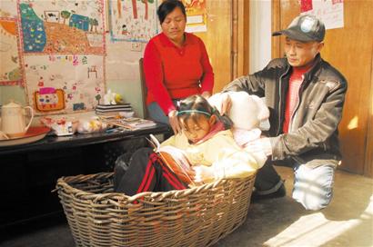 ????王永湖告訴記者,自從女兒得了這種怪病后,他和妻子十分著急。小朝君是一個非常愛學(xué)習(xí)的孩子,幾天不上課就又哭又鬧,但小朝君的雙腿發(fā)軟根本無法繼續(xù)到學(xué)校上課。為了滿足孩子的愿望,王永湖和妻子想出了一個辦法,他們用裝玉米的籮筐,放上被子后將女兒放進(jìn)籮筐里,每天早上兩人推著小推車送女兒到3公里外的學(xué)校上課。剛開始小朝君的病情還不經(jīng)常發(fā)作,但這樣過了一個月,小朝君的病情越發(fā)嚴(yán)重,每天都會在課堂上昏倒數(shù)次,最多一天昏倒20多次。