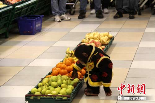 中新網(wǎng)南京12月6日電(唐娟 許以海)6日,江蘇常州的一超市內(nèi),來(lái)了三個(gè)身穿唐裝的特殊“顧客”。當(dāng)他們自顧的在超市內(nèi)采購(gòu)自己喜歡的水果時(shí),場(chǎng)內(nèi)的其它顧客才發(fā)現(xiàn),原來(lái)是三只小猩猩。