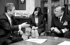 ????日本防衛(wèi)大臣北澤俊美9日與馬倫舉行會談,雙方表示要加強(qiáng)日美韓三國防衛(wèi)合作,并將這種合作提升至戰(zhàn)略水平。