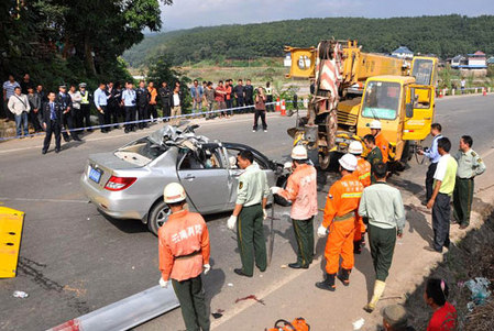 上午9時(shí)42分,景洪市景(景洪)大(大勐龍)二級公路18公里曼達(dá)糾村附近,一輛快速超車的比亞迪轎車撞上行駛中的一輛大吊車,導(dǎo)致車上的6名駕乘人員3死3傷。